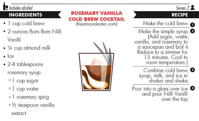 Đây là công thức của Rosemary Vanilla Cold Brew Coffee Cocktail kết hợp Cold Brew với rượu có vị vani. Hãy thử làm theo và cảm nhận hương vị độc đáo của loại cocktail lạnh này.