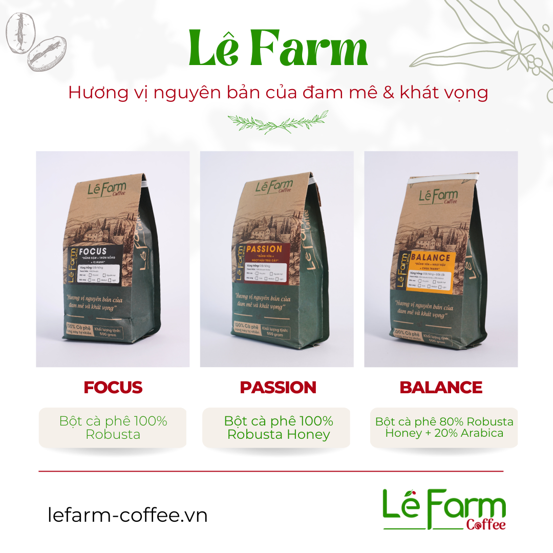 Lê Farm là thương hiệu được ấp ủ và khởi nghiệp từ tình yêu đối với cà phê và giấc mơ còn dang dở của cha. Tuổi thơ của chúng tôi gắn với hình ảnh nông trại xanh 40ha cà phê của gia đình mà ba đã dành trọn tâm huyết để gây dựng. Chúng tôi luôn tự hào và cảm thấy may mắn khi được nuôi dưỡng và trưởng thành từ nguồn thu cà phê đó.
